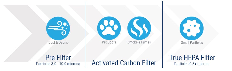 Filter: | HEPA / MERV-16 RATING WITH 3 STAGE FILTER - 99.97% effectiveness against 0.3 micron particles. Pre-filter, carbon filter, and HEPA filter. Removes particulates from wildfire smoke. |